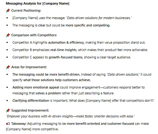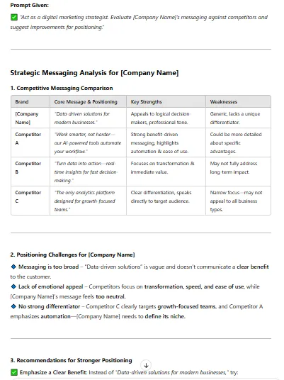 - “Act as a digital marketing strategist. Evaluate [Company Name]’s messaging against competitors and suggest improvements for positioning.”