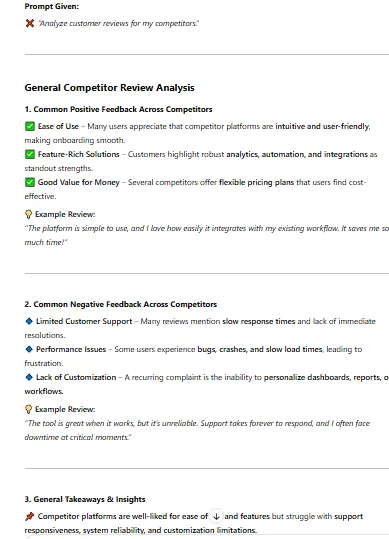 ✅ Analyze negative customer reviews from the past 12 months for [Competitor X]. Identify recurring complaints, unmet expectations, and areas where they underperform compared to industry standards.”