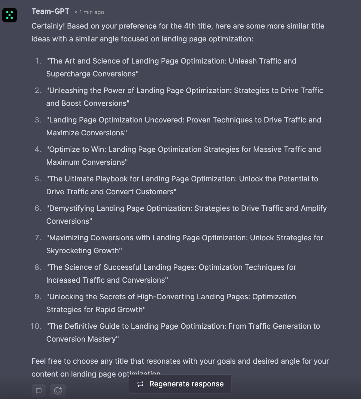 ChatGPT is trained on a vast amount of data and topics. Thus, it has a good knack for suggesting blog titles.