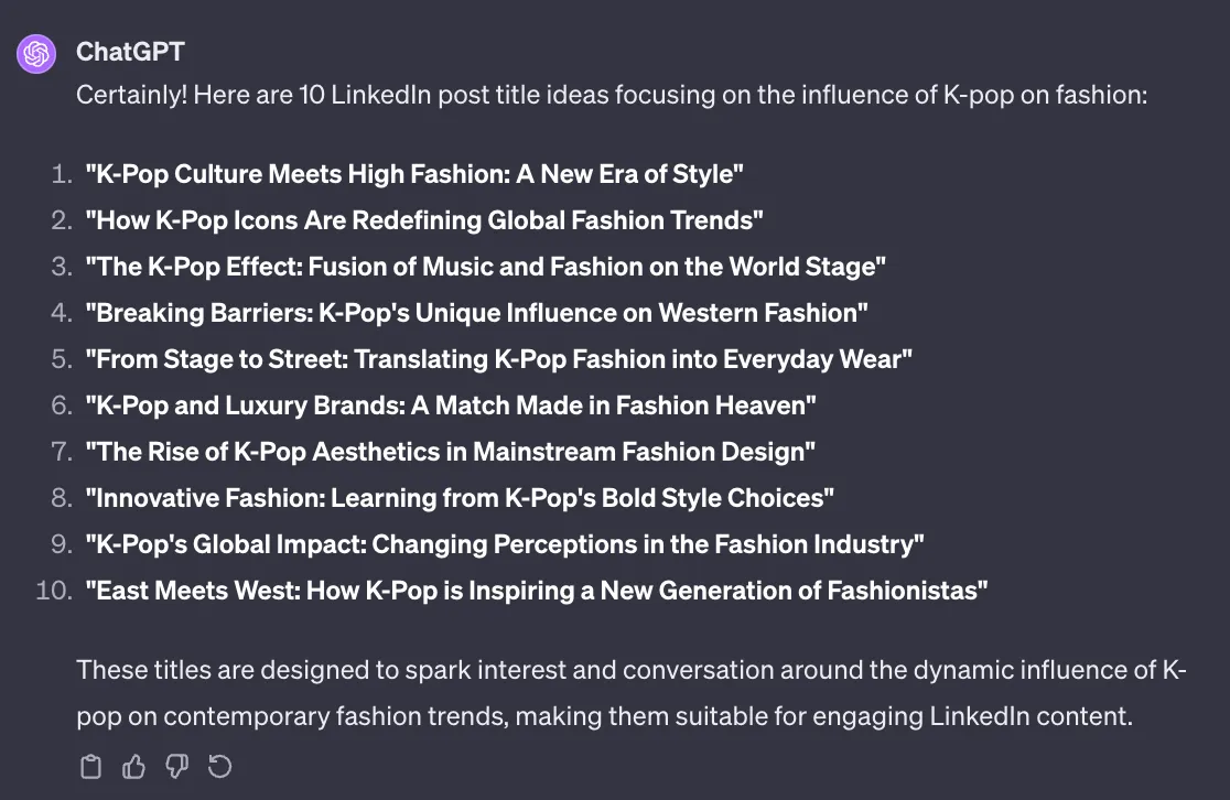 I like the ‘Influence of K-pop on Fashion’ idea you have for me. Can you suggest 10 LinkedIn post title ideas I can do on it?