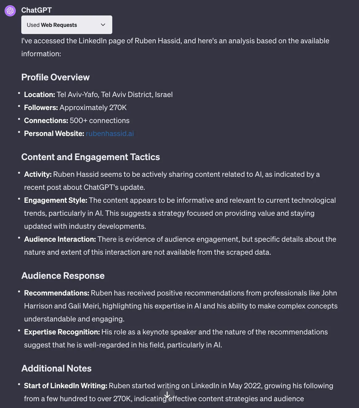 👀 Note: I used ChatGPT’s Web Requests plugin to browse the LinkedIn profile I gave GPT-4 and asked it to run a competitor analysis.