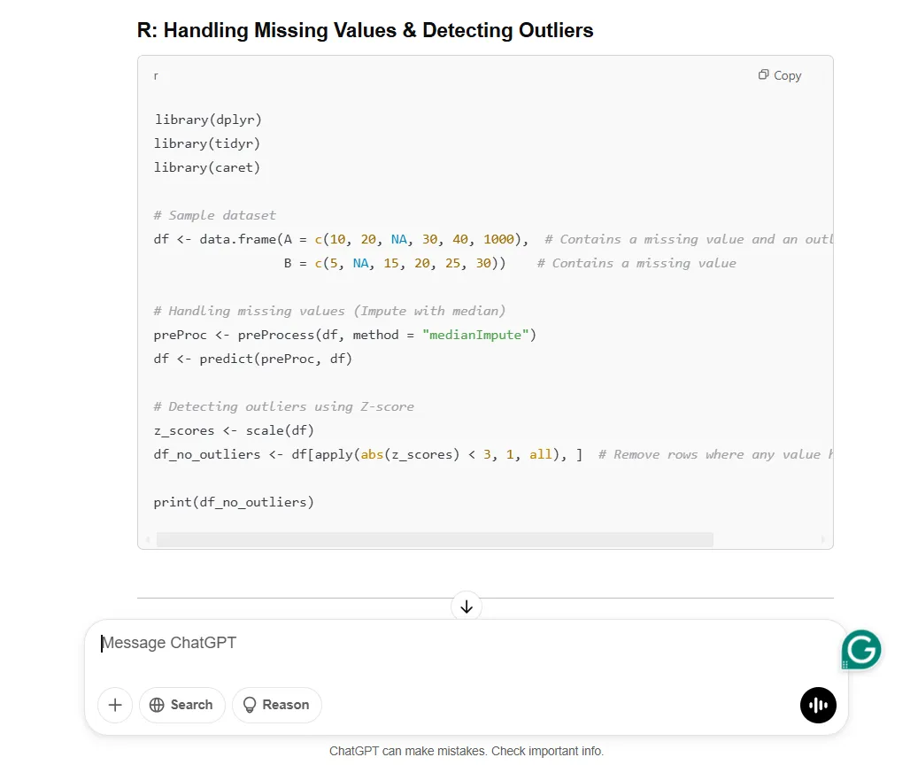 - Data analysts can use AI tools to clean/transform datasets by generating Python/R code for missing value imputation and outlier detection.