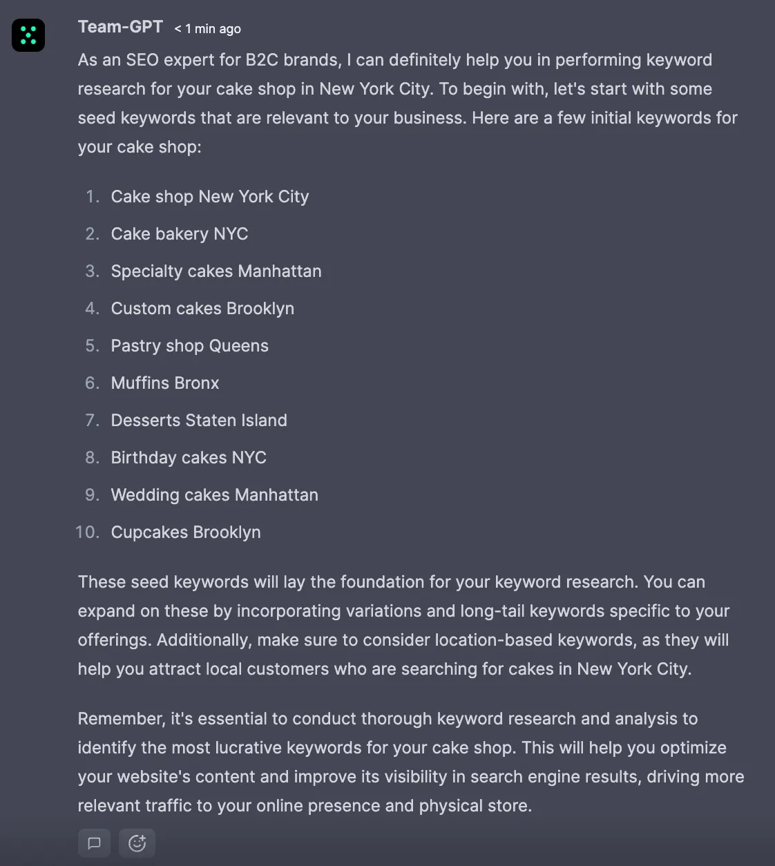 Let’s say you own a cake shop in New York and want to grow your visibility in the neighborhood. Here’s the prompt you can use to brainstorm some keywords 👇