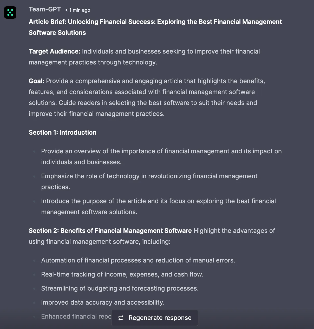 Suppose we want to generate article title ideas for one of the topics from our article we’re writing to target the primary keyword – best financial management software. Here’s how ChatGPT can help you brainstorm creative title ideas.