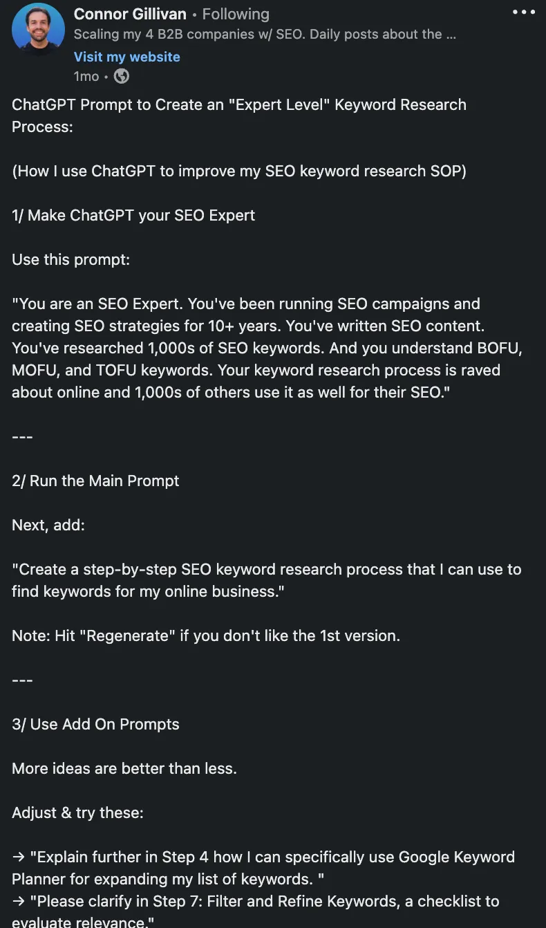 2. Make ChatGPT an Expert Keyword Researcher – Connor Gillivan