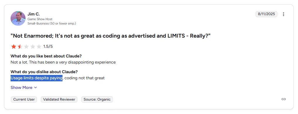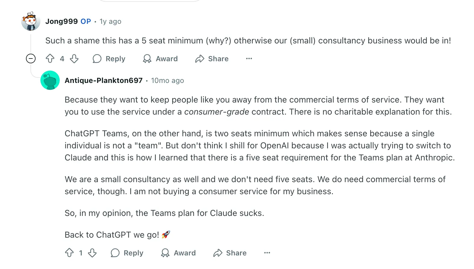 Last but not least, smaller marketing teams are not happy with the fact that Claude Team starts from 5 seats, making it inaccessible for smaller teams.