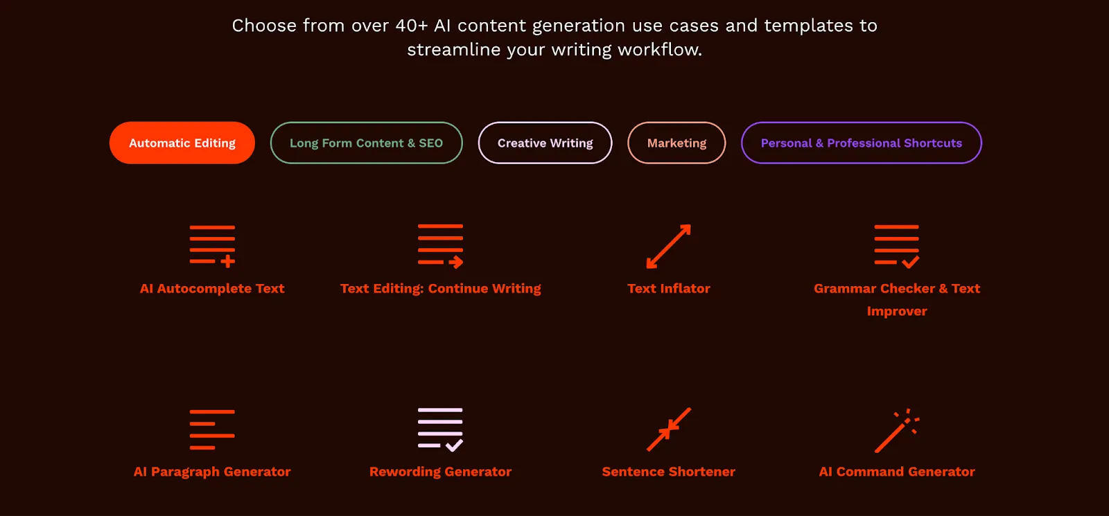 - Select from 40+ content types, including blog ideas, social media ads, and product descriptions.