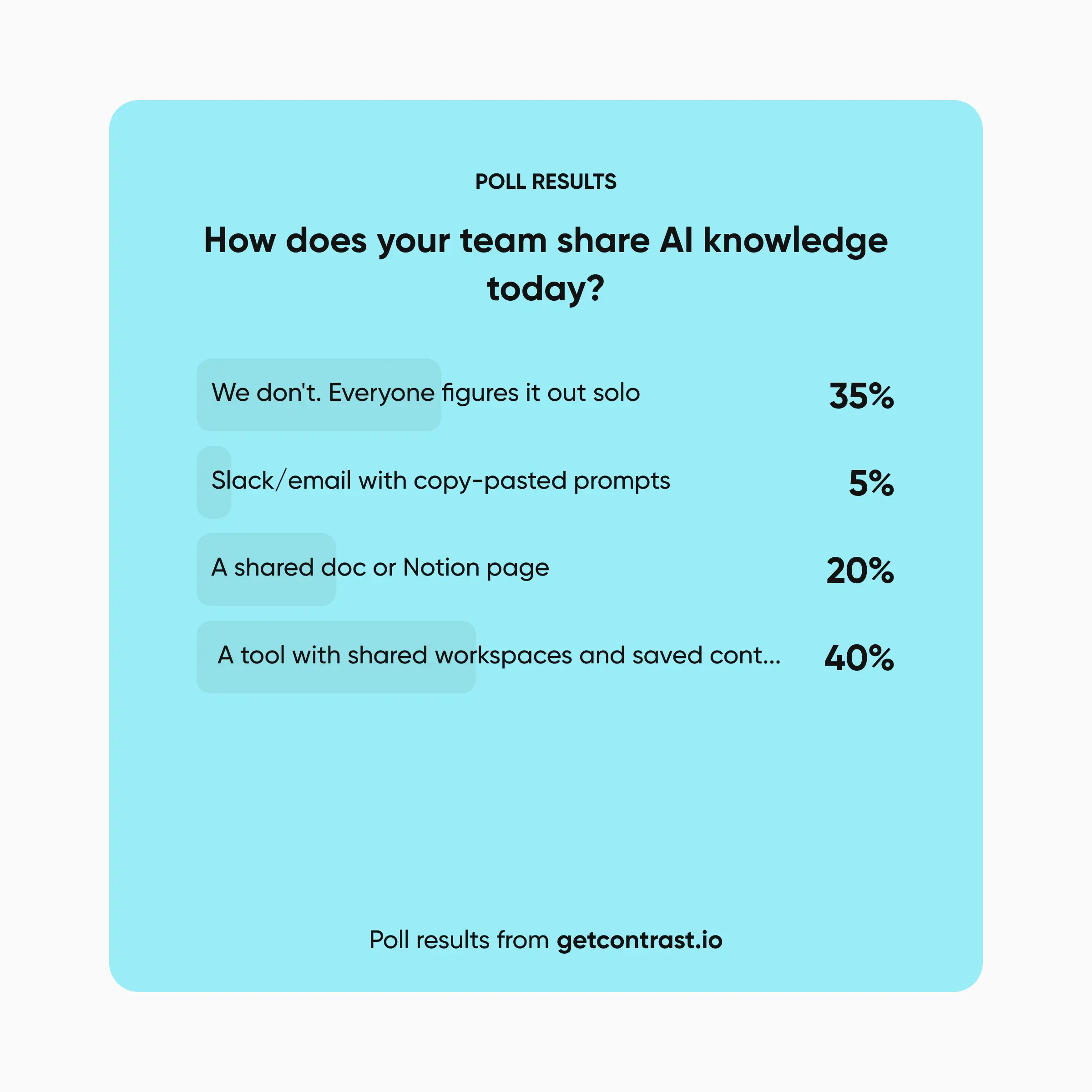 35% of teams do not share AI knowledge at all. Another 5% copy-paste prompts in Slack. That means 40% of teams start from zero every time someone opens an AI tool.