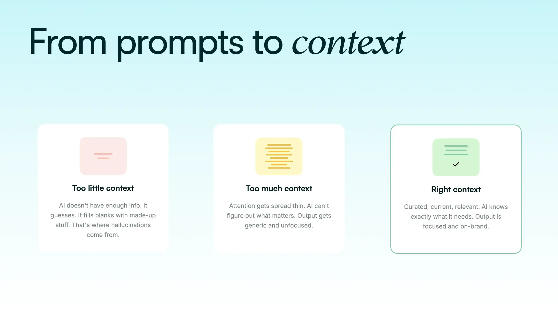 The next evolution is already happening. AI agents that browse context and select the most relevant parts for each task. Marketing teams that build context once and scale content production without limit.