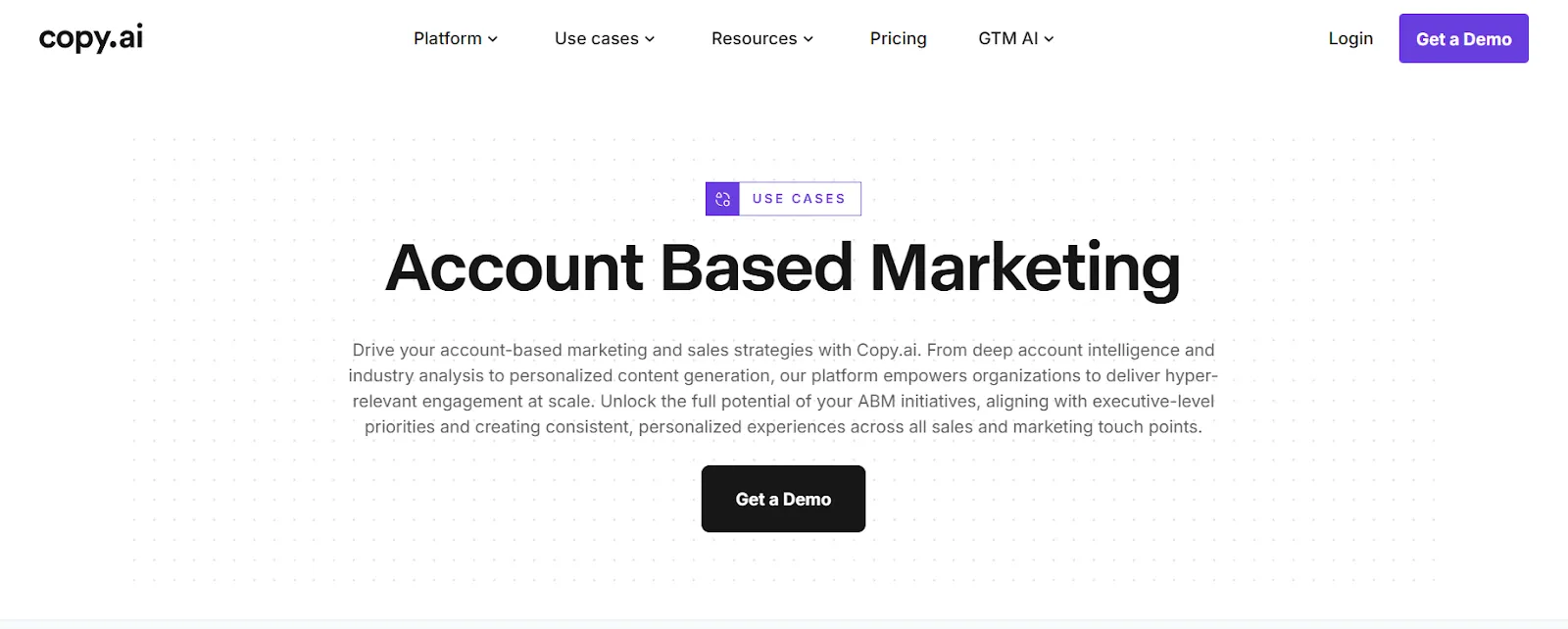 - ABM Content: Armed with intelligence data, Copy.ai will create account-specific content for multi-channel campaigns.