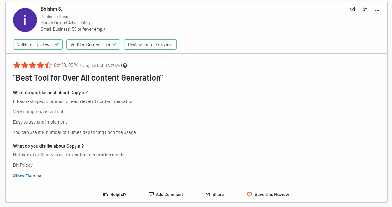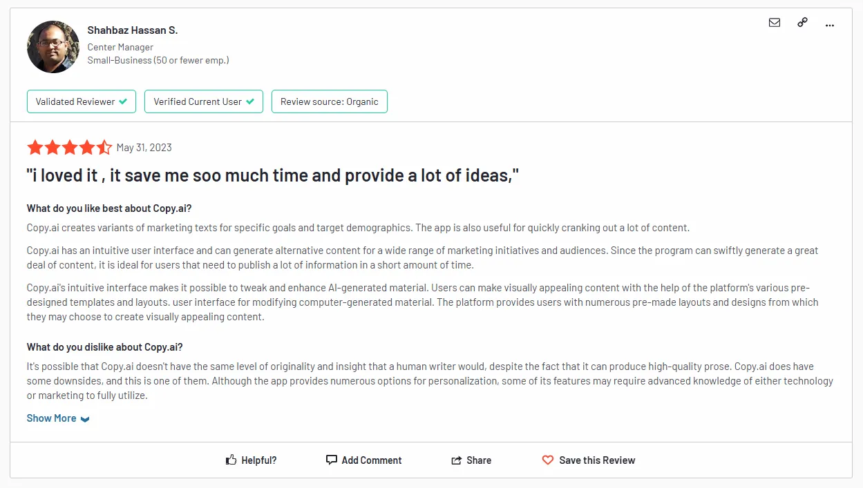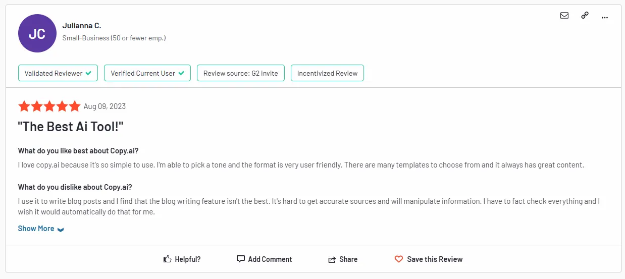 “Copy AI has an intuitive user interface and can generate alternative content for a wide range of marketing initiatives and audiences. Since the program can swiftly generate a great deal of content, it is ideal for users that need to publish a lot of information in a short amount of time.” — G2 Review.