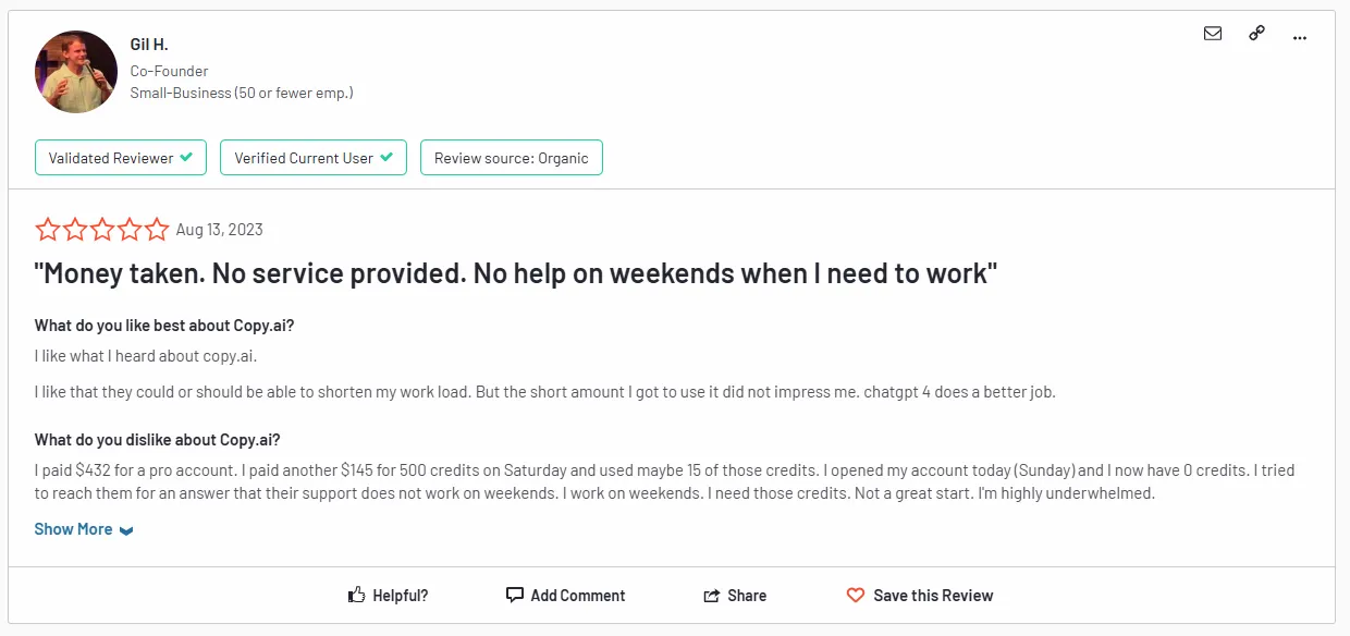 “I paid $432 for a pro account. I paid another $145 for 500 credits on Saturday and used maybe 15 of those credits. I opened my account today (Sunday), and I now have 0 credits. I tried to reach them for an answer that their support does not work on weekends. I work on weekends. I need those credits. Not a great start. I’m highly underwhelmed.” — G2 review