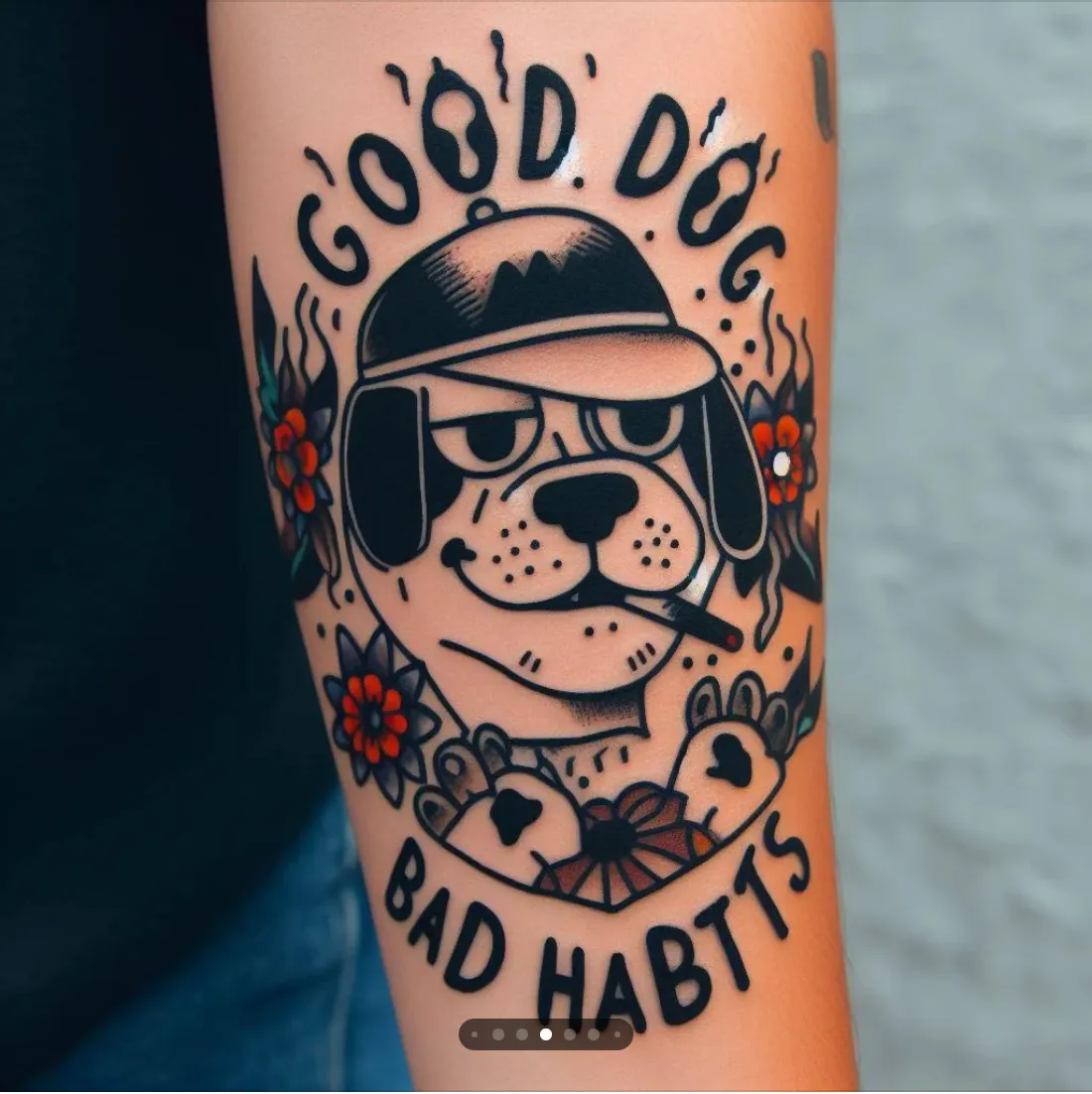 Prompt: An arm tattoo of a psychedelic cartoon-style dog with a mischievous grin, smoking a cigarette and wearing a hat. The text "GOOD DOG, BAD HABITS" is written above the dog in a bold, handwritten font.
