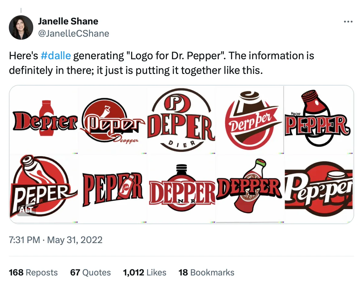 Here’s an X post by Janelle Shane from a few years back. She used Dall-E to redesign the logo of Dr. Pepper, a popular soft drink, in many variations and styles.