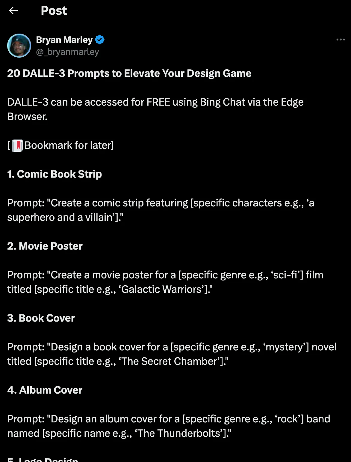 However, Dall-E-3 boasts the capability to design infographics seamlessly. Bryan Marley took to X to share a comprehensive 20-prompt guide for Dall-E-3 users to elevate their design game.