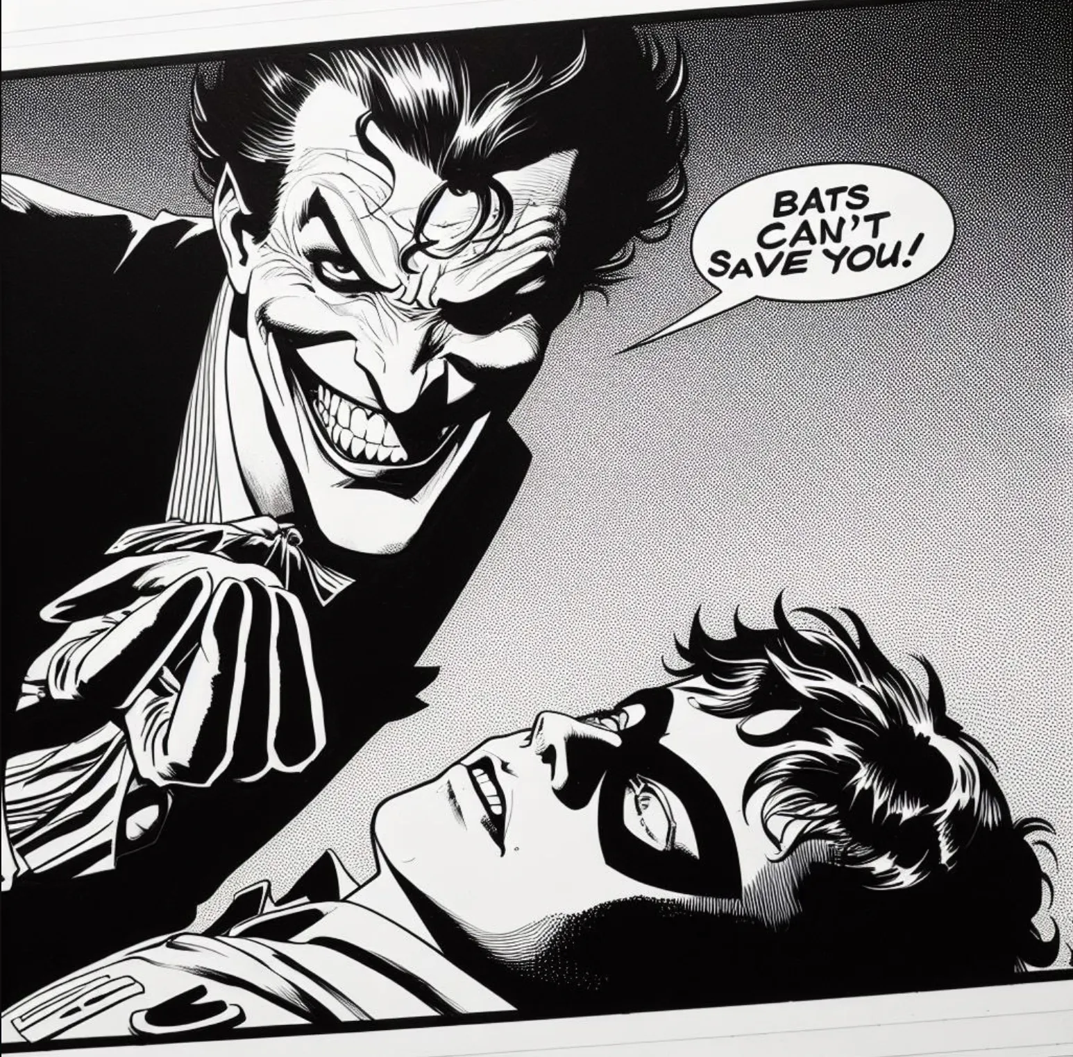 Prompt: create a black and white comic book panel with a close-up of the Joker towering over Robin lying on the ground. Include a comic bubble over his head saying, "Bats can't save you!"