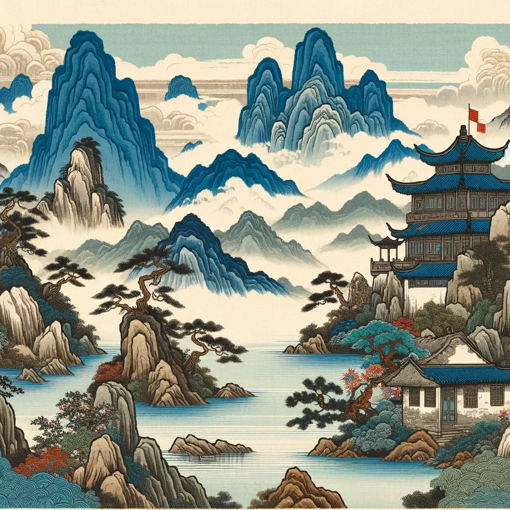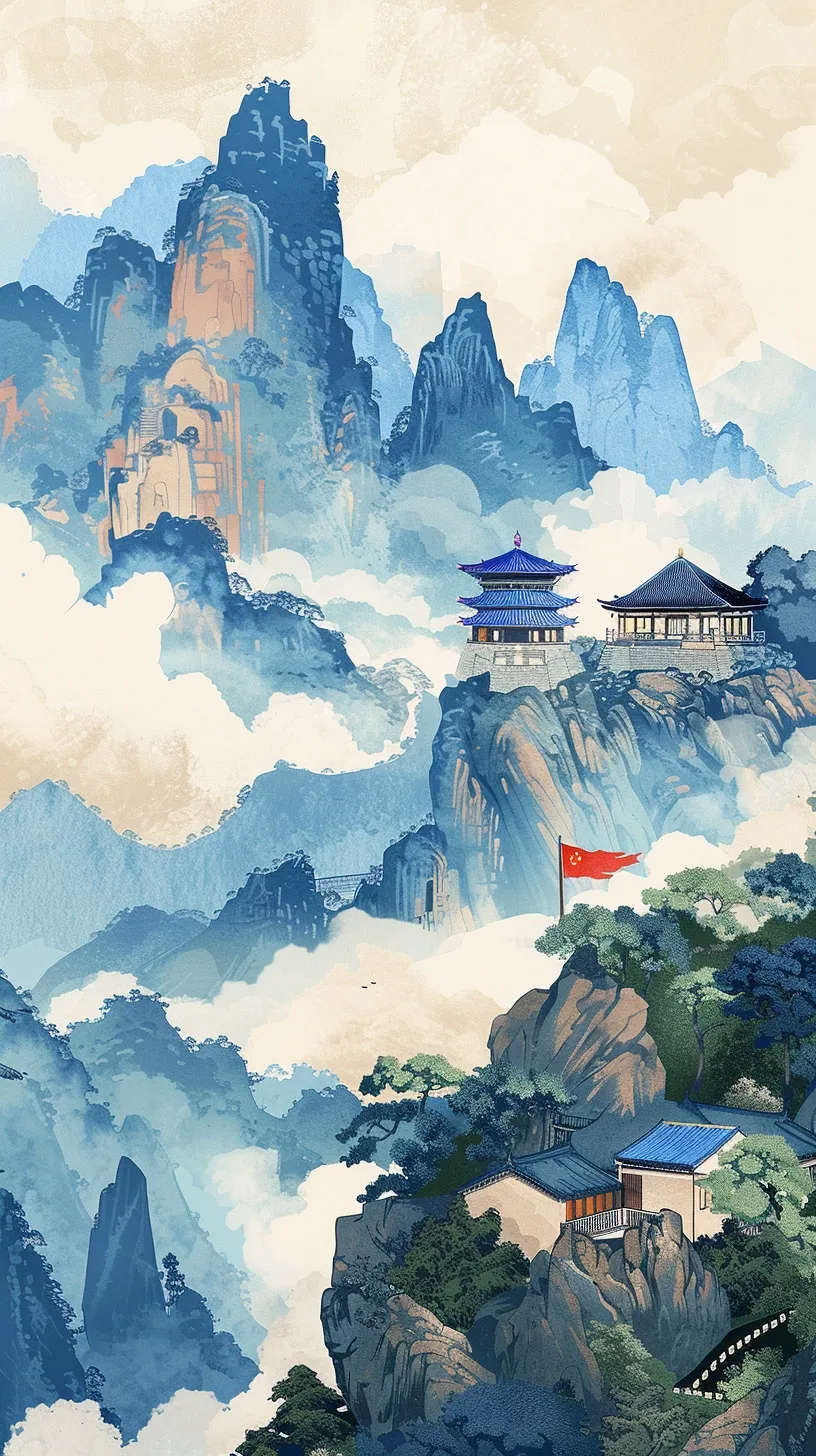 Prompt: Chinese landscape painting, blue mountains in the distance, Chinese style architecture on top of mountain, light gray and dark brown, colorful ink wash paintings, meticulous brushwork, colorful woodcut prints, mountains, rocks, clouds, green trees, blue sky, red flag, small house, golden age illustrations, in the style of colorful woodblock print, ultrahigh definition images, wetland scenery.