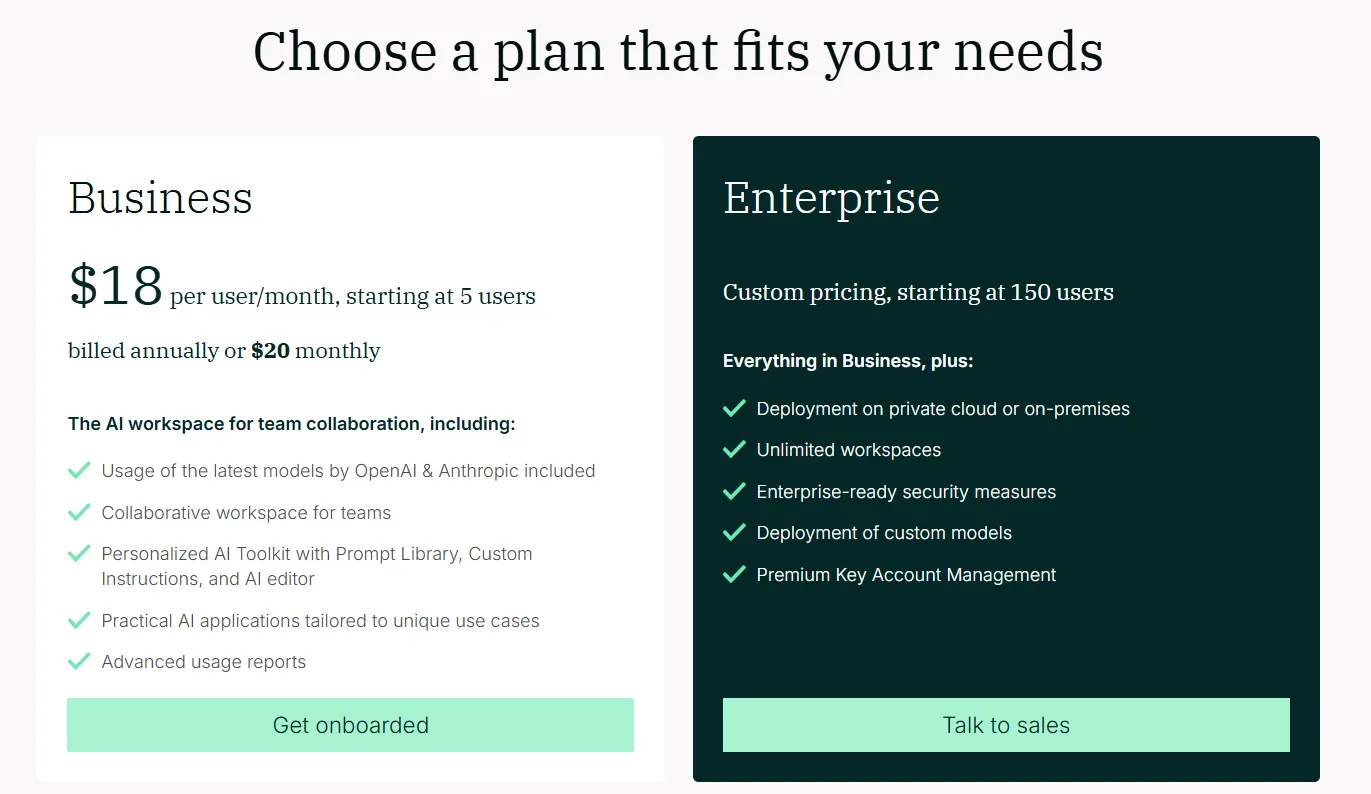- Business Plan: Costs $18 per user/month, with a minimum of 5 users required. This plan includes collaborative features, customizable AI toolkits, and detailed analytics.