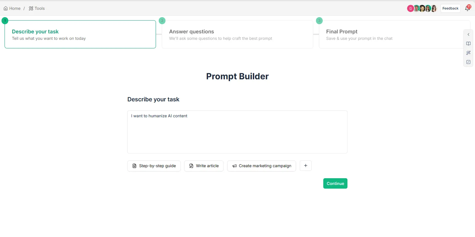 The way our prompt builder works is that you have to begin by describing your task, such as ‘‘I want to humanize AI content.’’