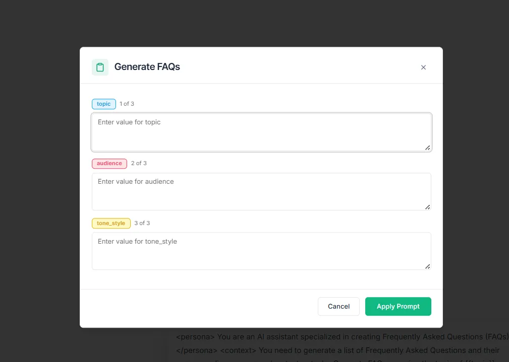 - A prompt builder, where you can build up your ideal prompt for FAQ generation.