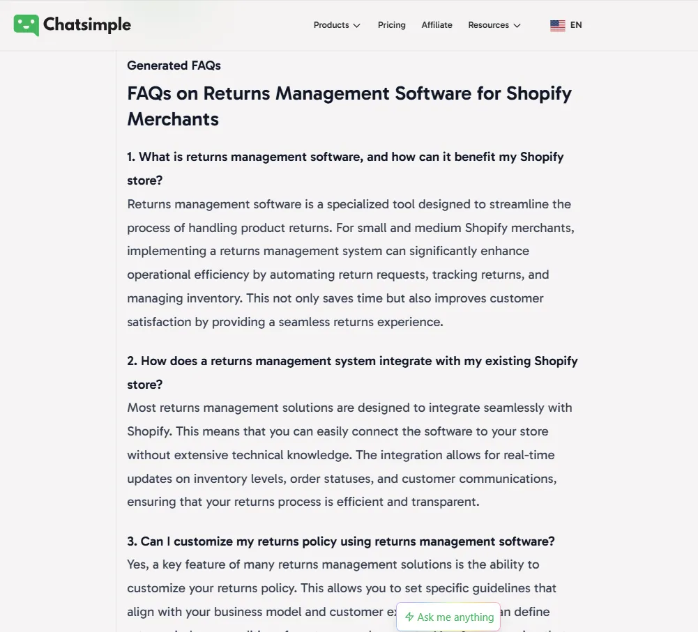 Here’s the FAQ output that I was provided with from Chatsimple: