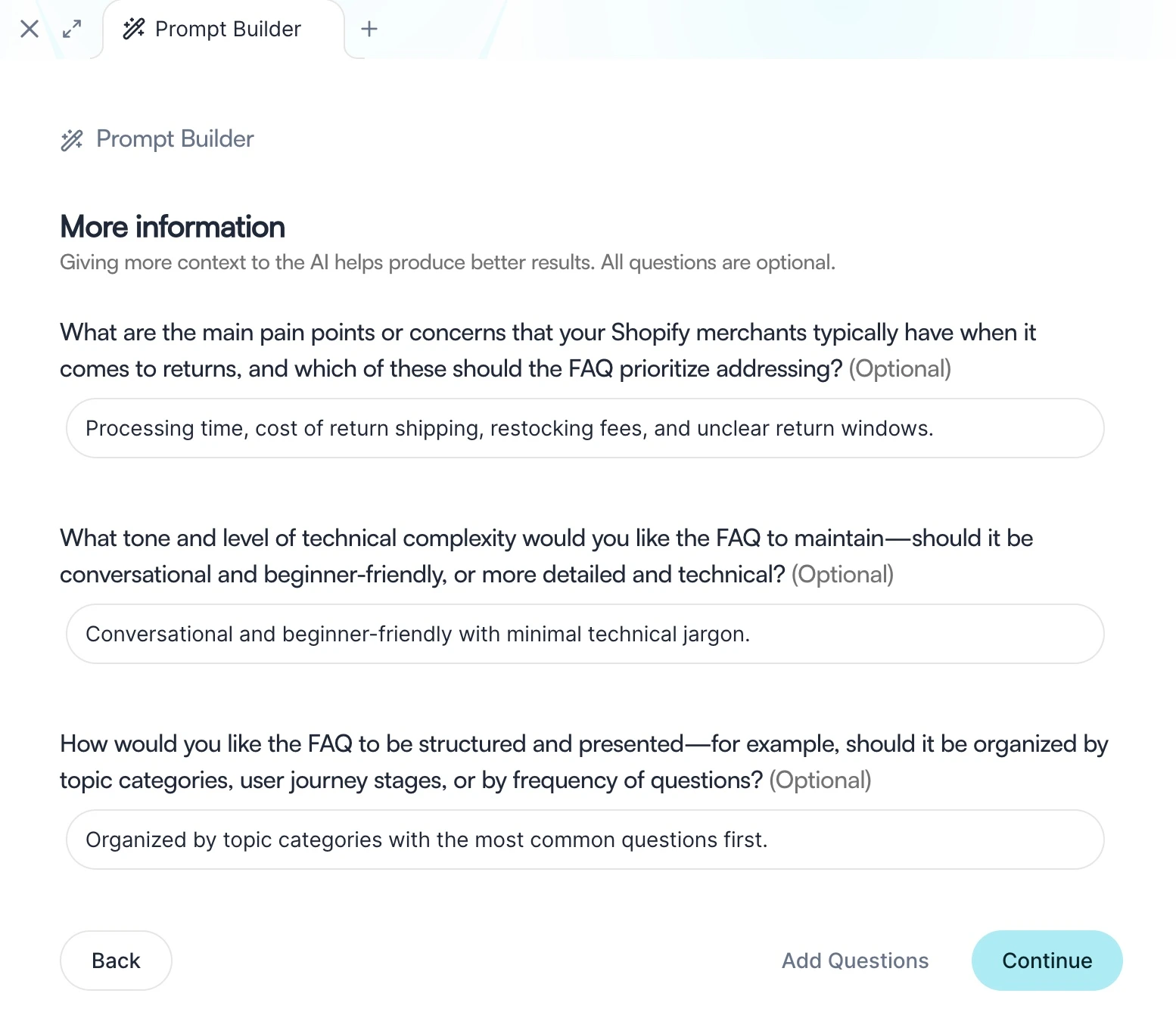After that, the prompt builder will ask you to answer a few follow-up questions about the FAQ section that you want to generate.