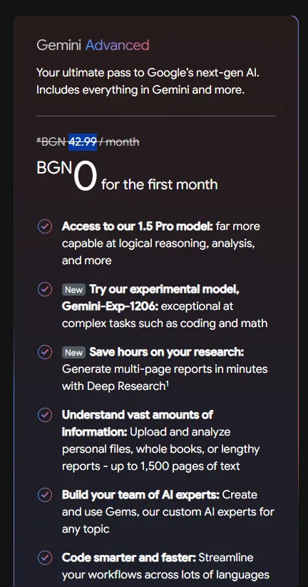 I was able to confirm this by trying to purchase Gemini Advanced in Bulgaria, where the cost was 42.99 BGN (equivalent to $23/month).