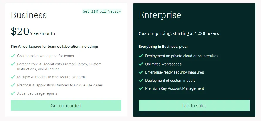 - Business: $20 per user per month, built for small to mid-sized companies, includes: