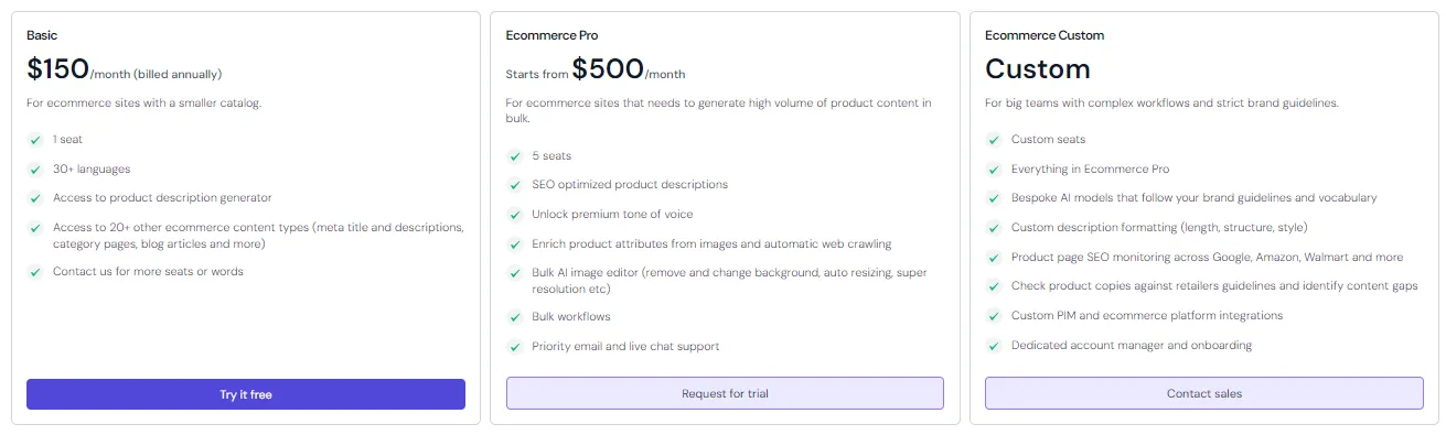 - Ecommerce Pro: Starts from $500/month, includes 5 seats, everything in Basic + SEO optimized product descriptions, bulk image editor, product enrichment from web crawling and images, and more.