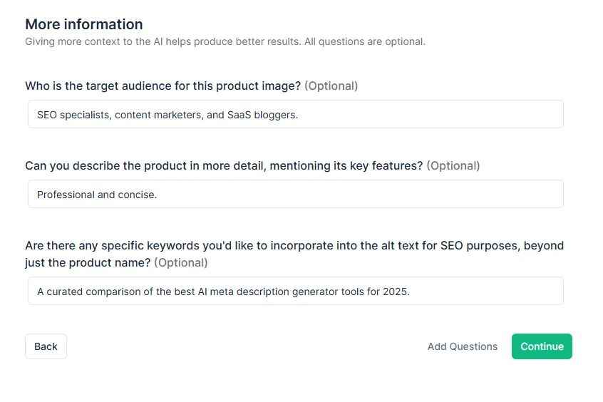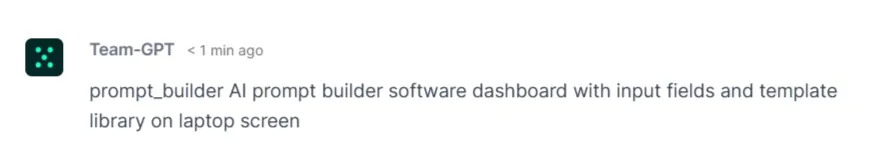 The way it works is that you describe the kind of alt text you want to generate (e.g., SEO-focused, product-based, concise), answer a few follow-up questions, and Team-GPT builds a high-quality prompt for you.