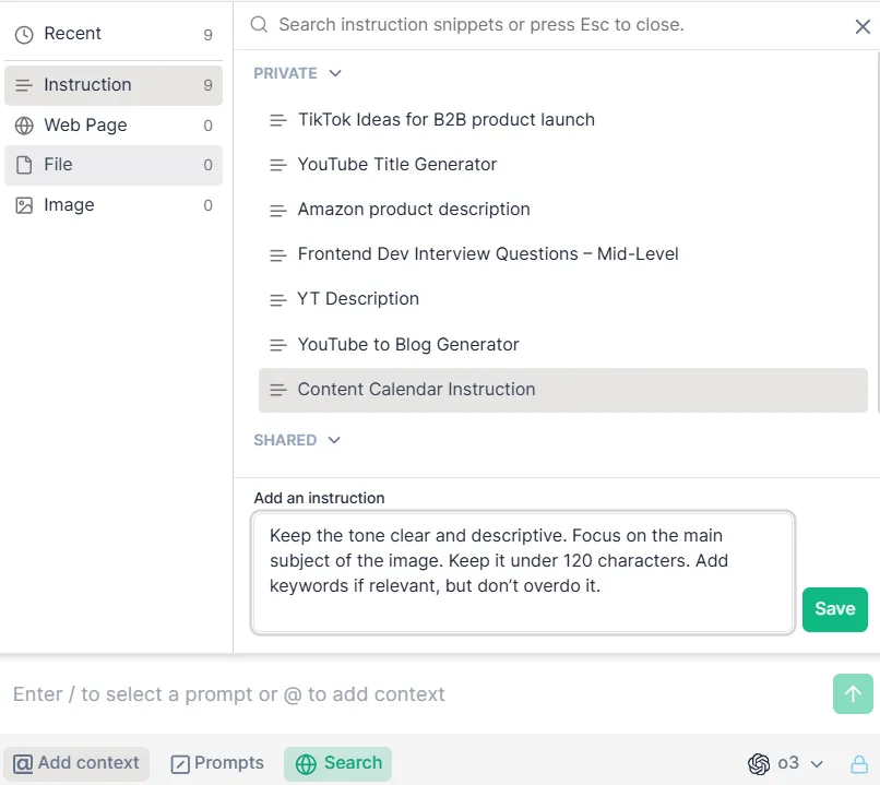 Here’s how I do it: Click on “Add Context” > “Instruction” > “Add an Instruction” > “Save”. I usually name it something like “Product Alt Text – SEO” or “Minimal Alt Text for Blog Images.”