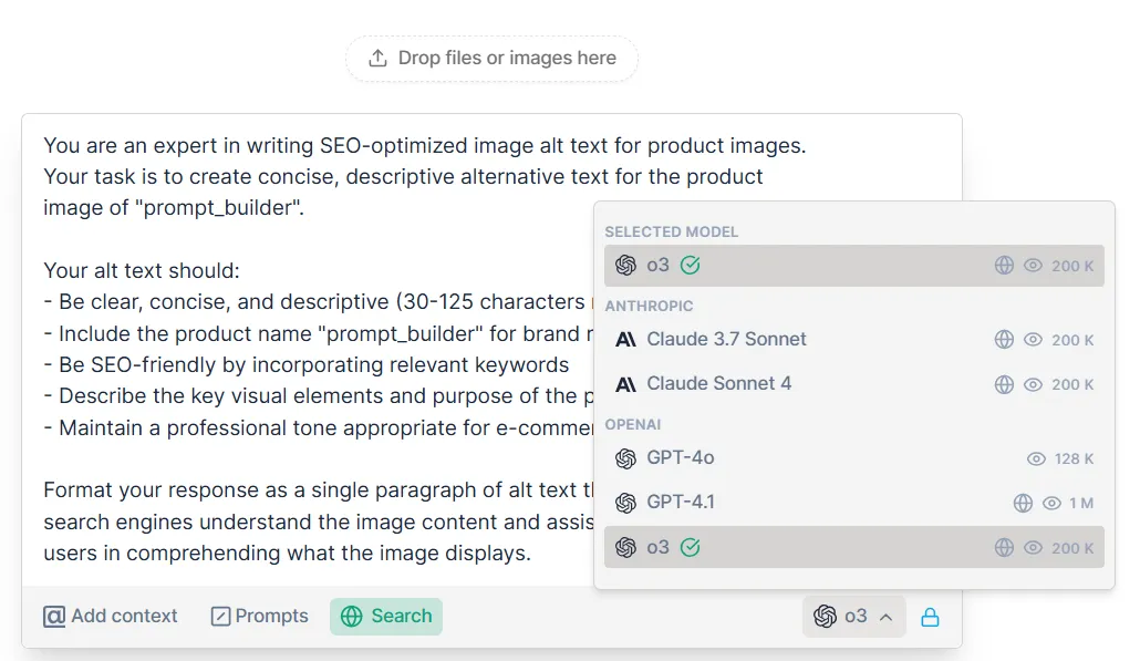 A lot of tools give you one generic alt text line as soon as you upload an image. While that might be fine for basic use, it falls short when you need your alt text to serve a purpose, like boosting SEO or aligning with brand tone.