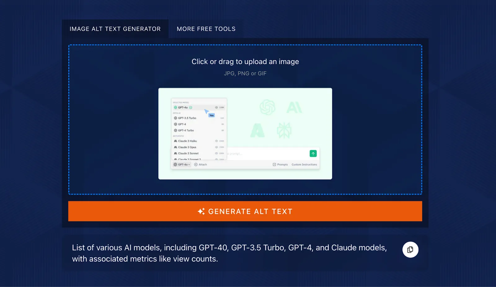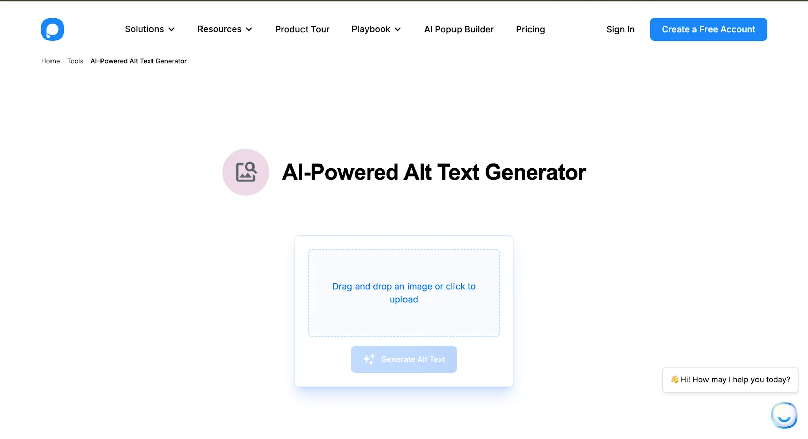 Popupsmart offers a free AI-powered alt text generator designed to improve image accessibility and SEO. You can upload images in formats like JPEG, PNG, WEBP, or GIF, and get a clean, accurate alt text in seconds.