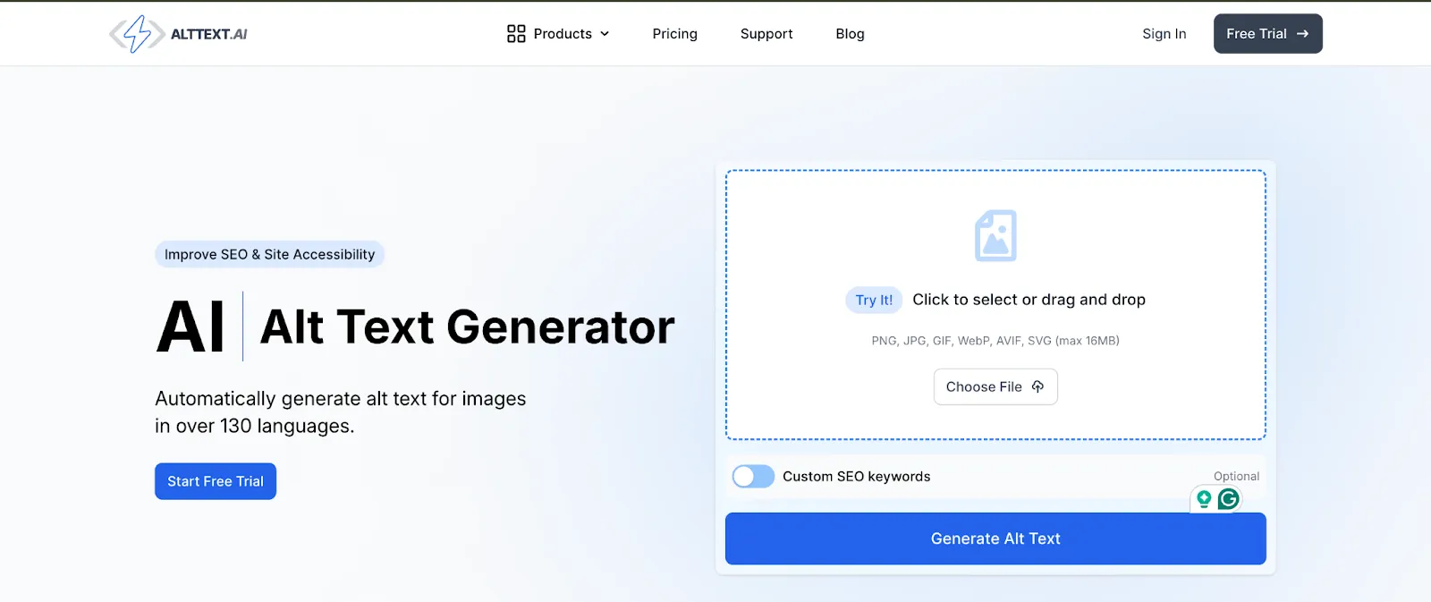 AltText.ai is a powerful AI tool built to automate image alt text creation across websites, apps, and CMS platforms. It supports more than 130 languages and works with image formats like AVIF, SVG, PNG, JPG, GIF, and WebP.
