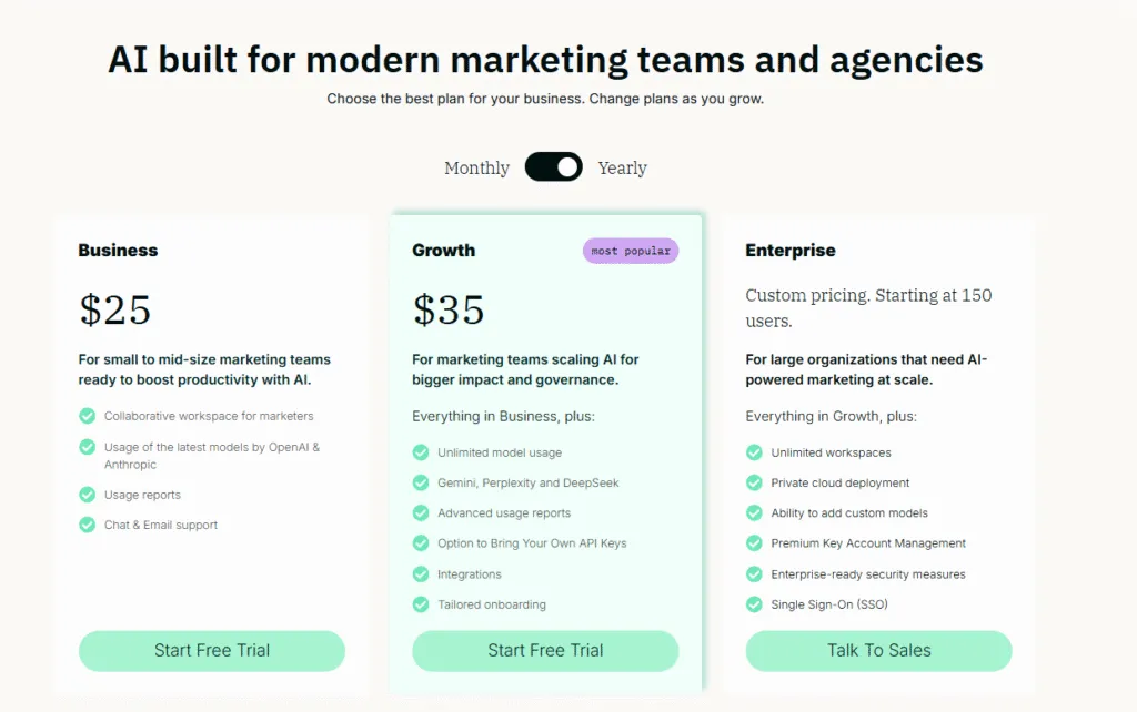 - Starter Plan ($25/user/month): Best for solo users or small teams. You get access to the prompt builder, AI models, shared folders, and usage tracking.