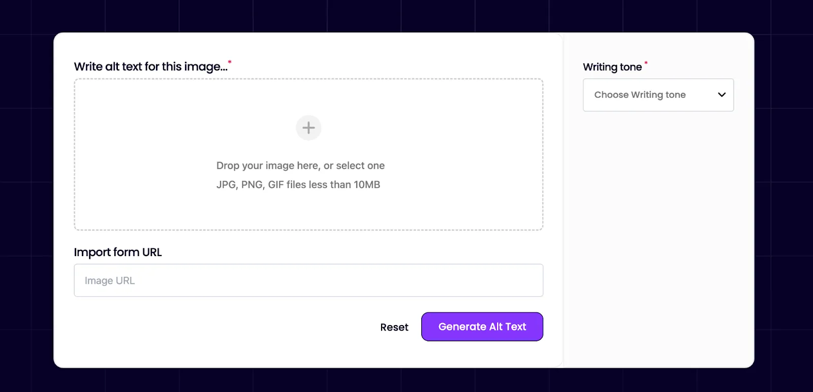 Best for: Bloggers, marketers, and e-commerce teams who want fast, descriptive, and SEO-friendly image alt text.