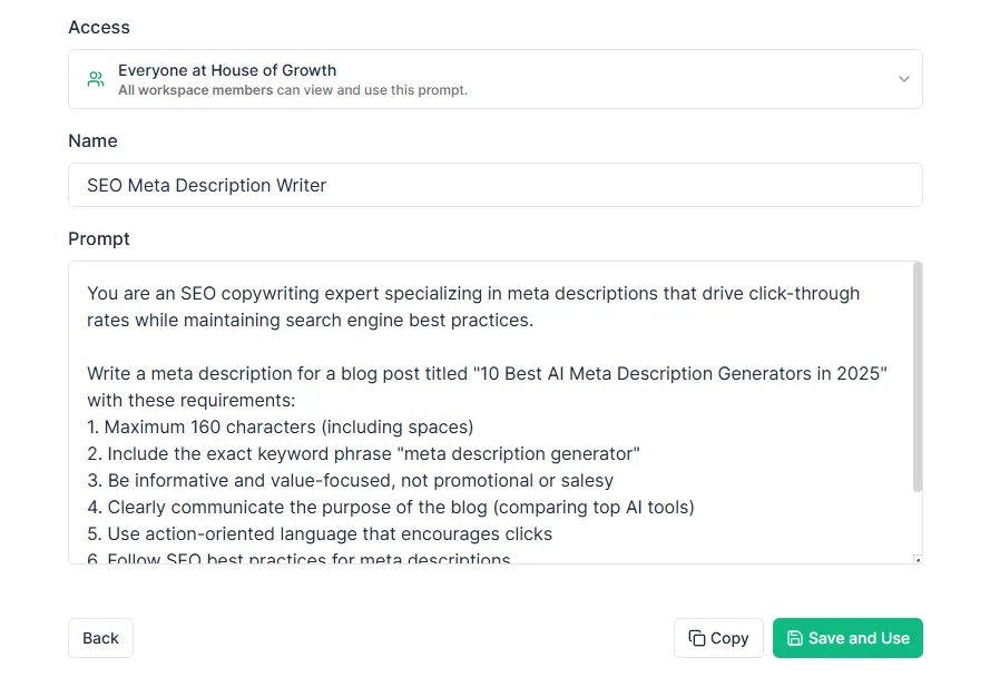 But if you’re serious about writing better meta descriptions across your team and want full control over the tone, structure, and prompt logic, Team-GPT is your best option.