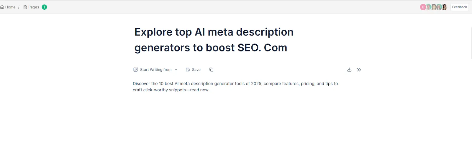 It works well if you manage multiple pages and need fast, SEO-friendly metadata that accurately reflects your content. The tool is especially useful when you’re short on time and need to generate clean, to-the-point metadata for blogs, landing pages, or service listings.