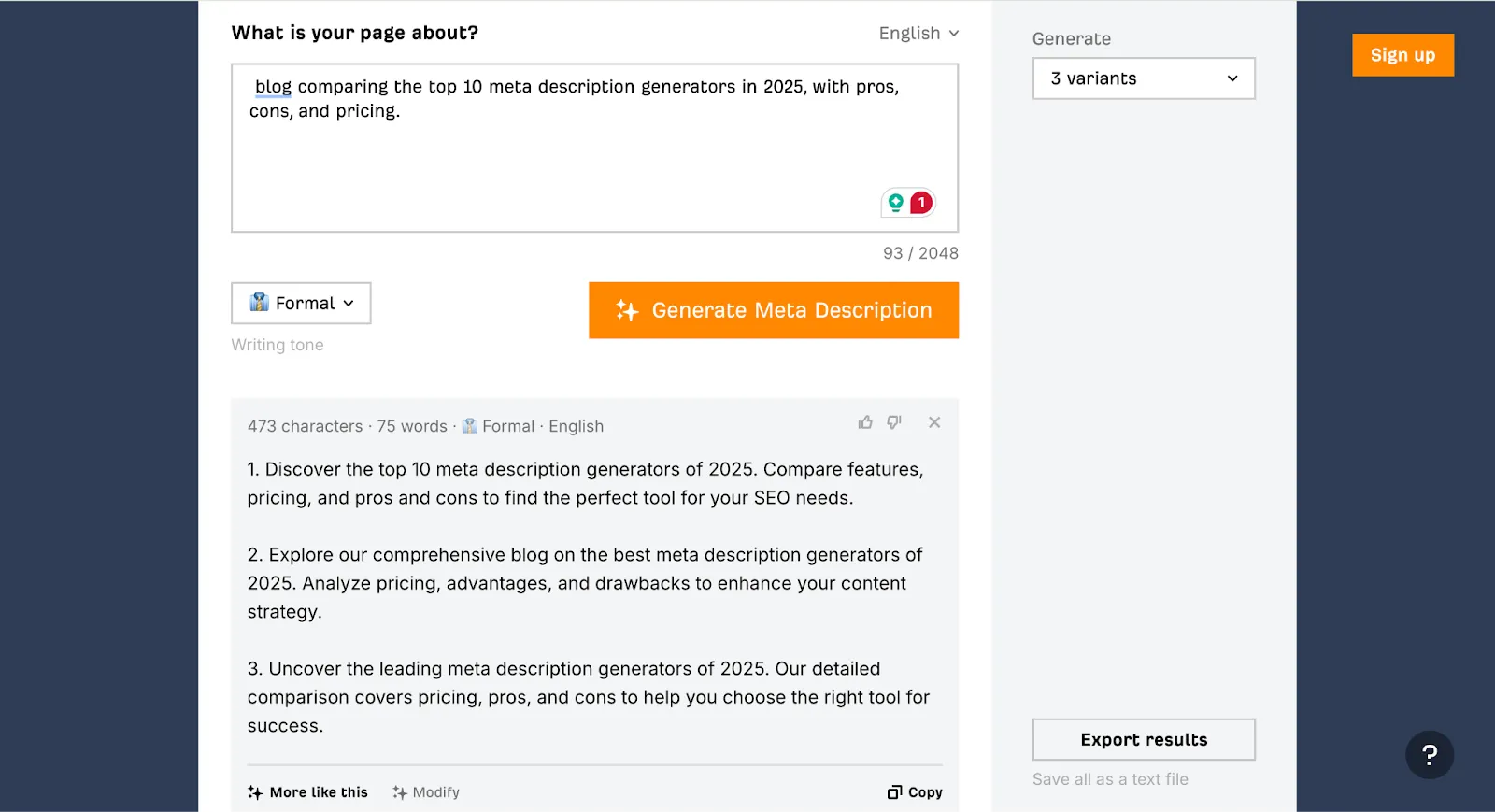 A good generator lets you pick from different tones, like professional, friendly, or direct. It should also help you keep your descriptions within the ideal length range (around 150–160 characters), so your snippet doesn’t get cut off on search engine result pages (SERPs).