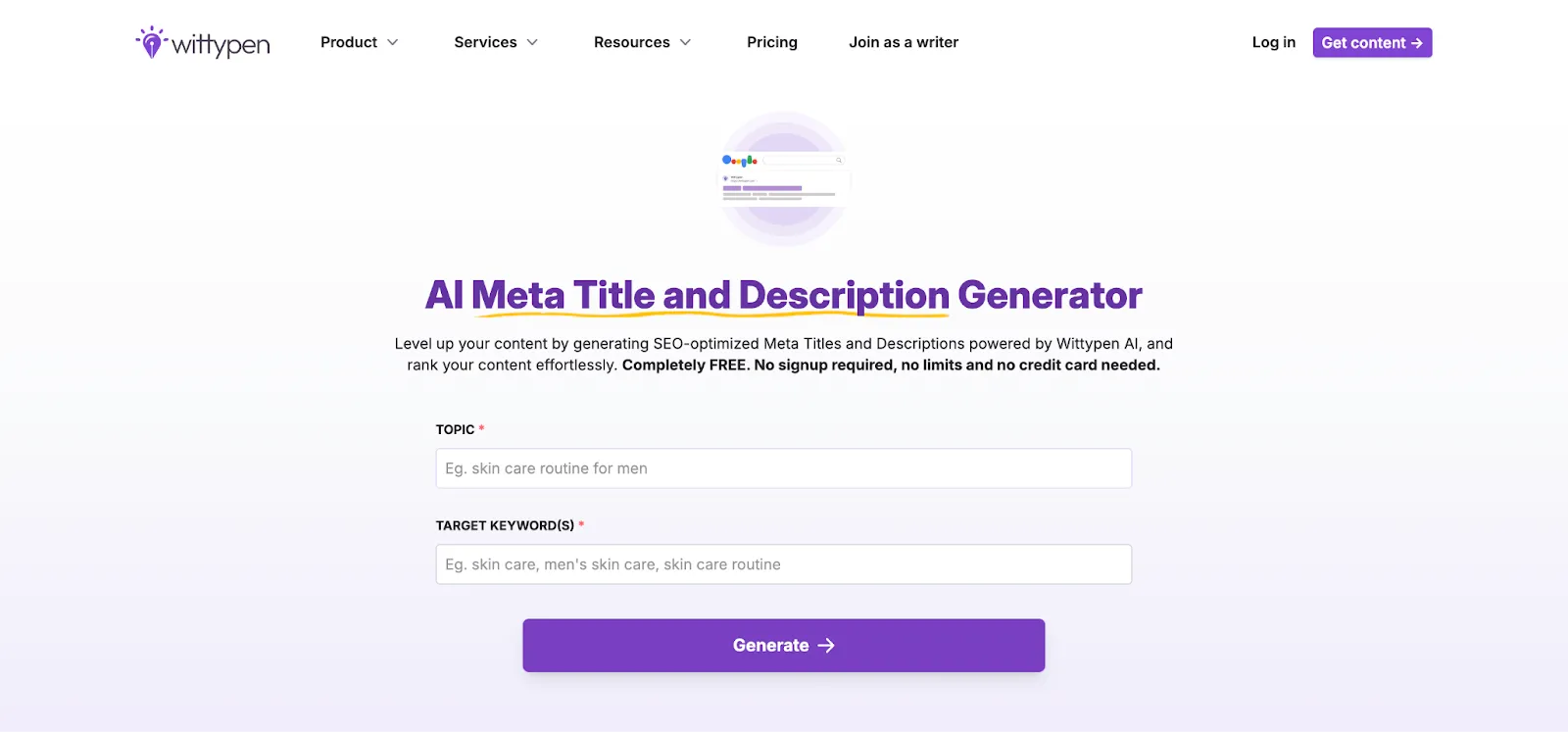 Wittypen’s AI Meta Title and Description Generator helps you write clean, SEO-optimized meta titles and descriptions in seconds. You don’t need to create an account or sign up for anything; it’s completely free to use without limits. All you need is your topic and keywords.