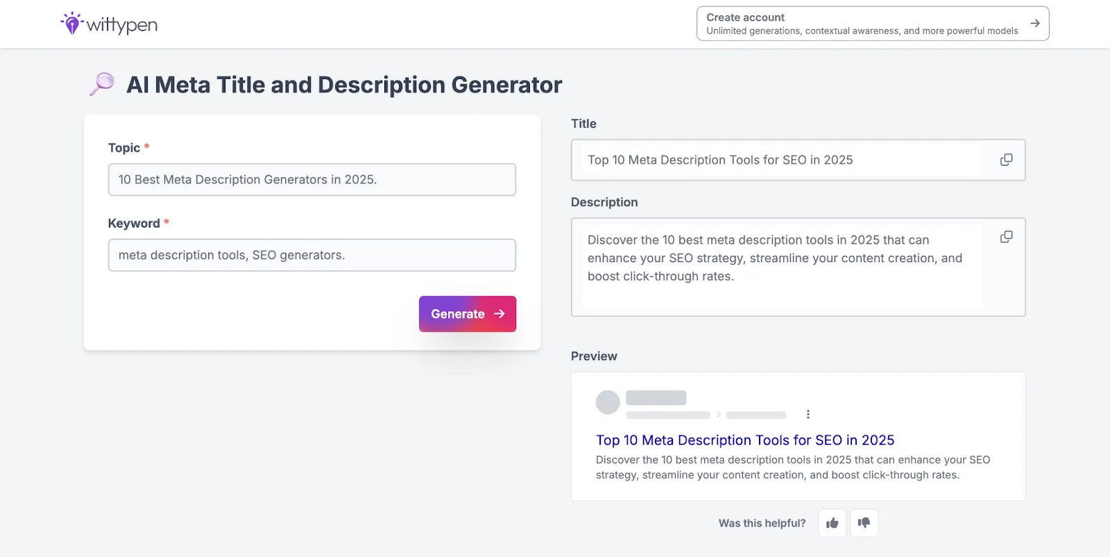 I used Wittypen to generate a meta description for this Team-GPT blog on “10 Best Meta Description Generators in 2025.” I entered the topic and added keywords: “meta description tools, SEO generators.”