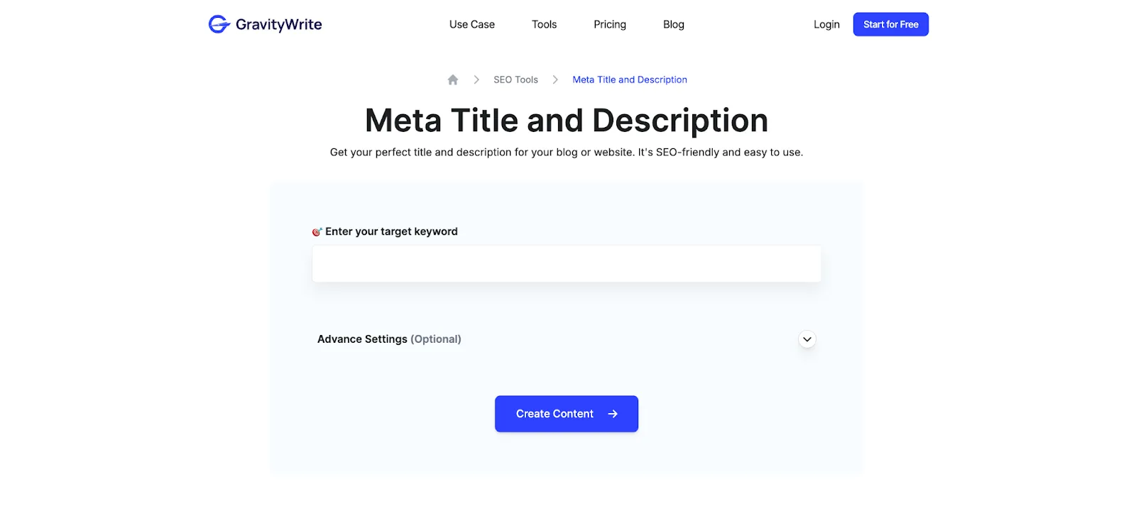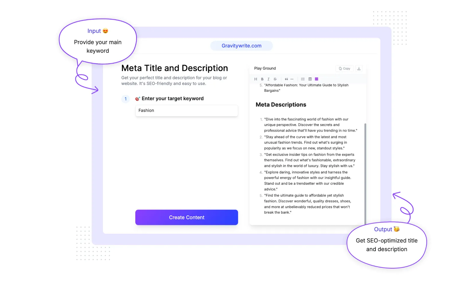 GravityWrite’s Meta Title and Description tool helps you create short, SEO-friendly summaries in seconds. It’s a simple template where you just enter your target keyword, and the tool does the rest. You don’t need SEO expertise or content writing experience to use it.