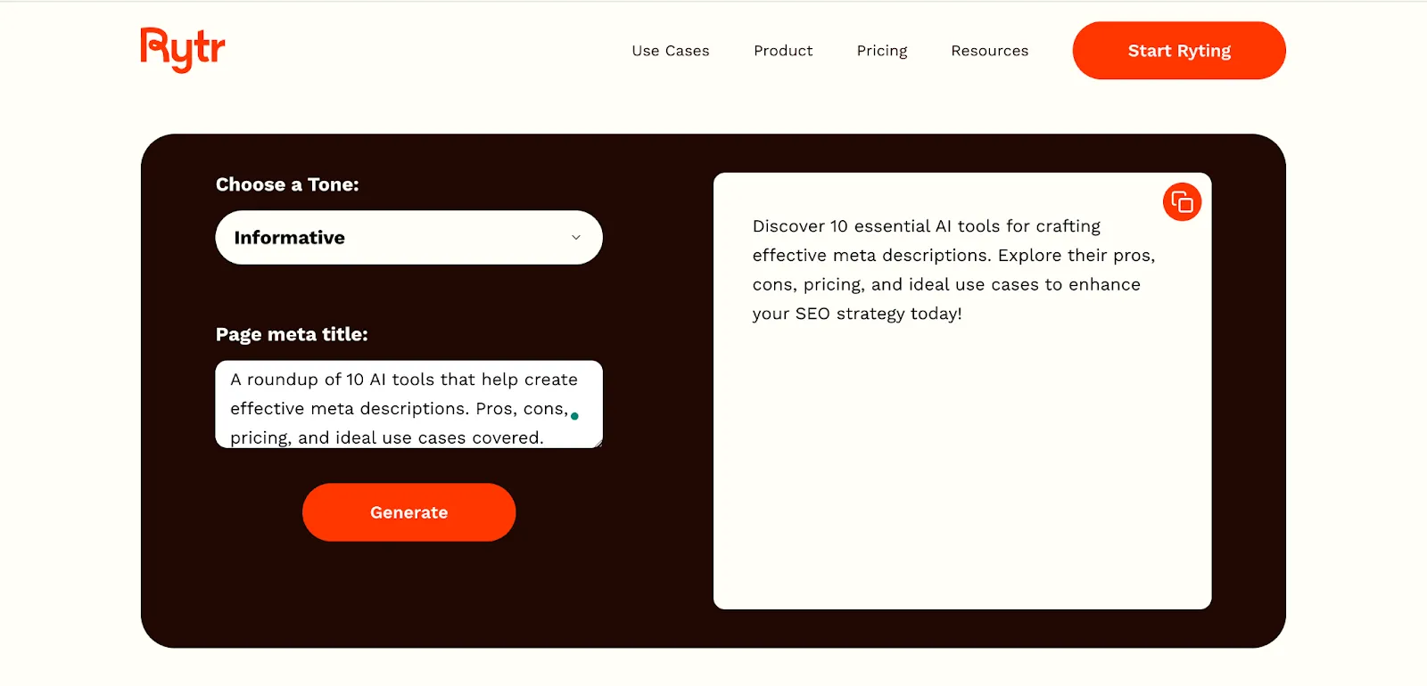 I entered: “A roundup of 10 AI tools that help create effective meta descriptions. Pros, cons, pricing, and ideal use cases covered.” Here’s what Rytr generated:
