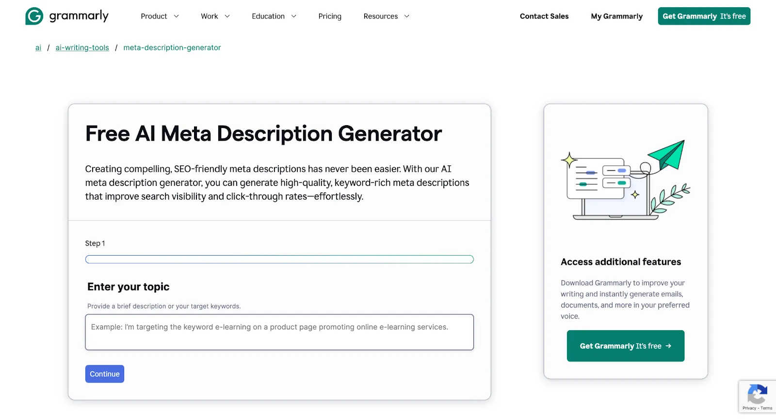 Grammarly’s AI Meta Description Generator is simple, fast, and free. It helps you write clear and keyword-friendly summaries for your web pages. Whether you’re writing for a blog, product page, landing page, or business report, Grammarly guides you through the basics: what the content is about, how long the meta description should be, and the tone you want.