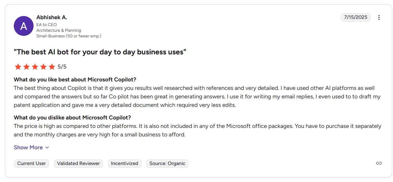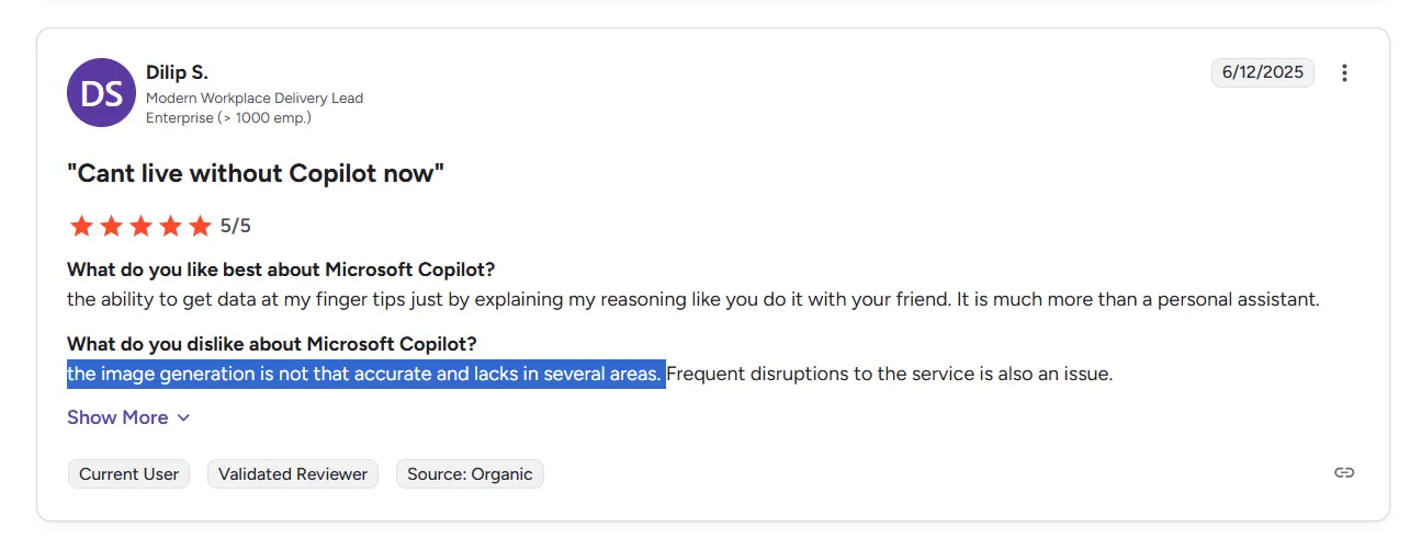 Even though some marketers are happy with the tool’s ease of use and integration into Microsoft’s suite of products, they’re not satisfied with how expensive the solution can get, image generation, and difficulty referencing past conversations.