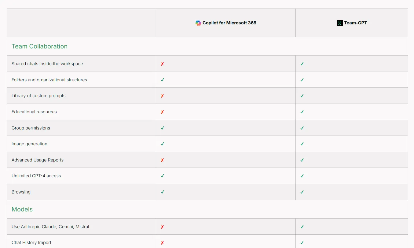 - Microsoft 365 Copilot vs. Team-GPT: Copilot integrates seamlessly with Microsoft apps for task automation, whereas Team-GPT provides a dedicated AI workspace for brainstorming, writing, and organizing knowledge across multiple models.
