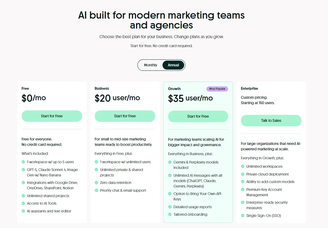 - Enterprise: Custom price. Available for a minimum of 10 users. Including unlimited AI content creation and workflow automations.