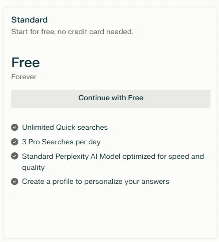 The free plan is ideal for casual users or those exploring AI-powered search tools. Here’s what you get: