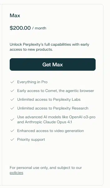 Perplexity’s $200/month Max plan is designed for users who need the highest level of AI productivity and access to advanced tools.