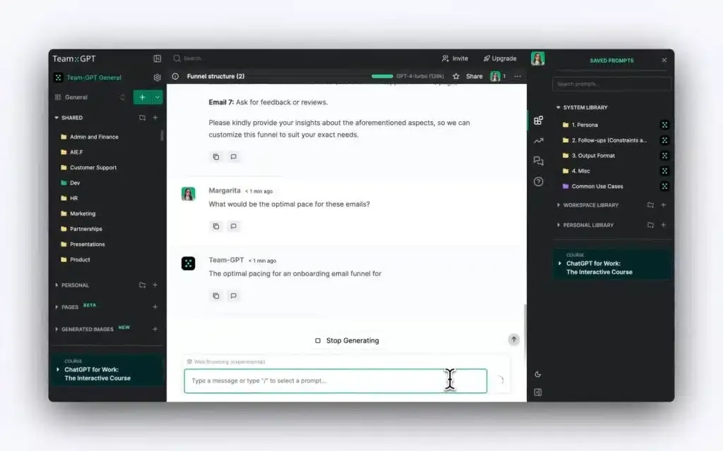 - Personas: You can prompt Team-GPT’s AI model to act as a specialist in a certain area (e.g., marketing specialist) and provide you with expert insights into the topic you’re interested in or to personalize content to a specific audience.